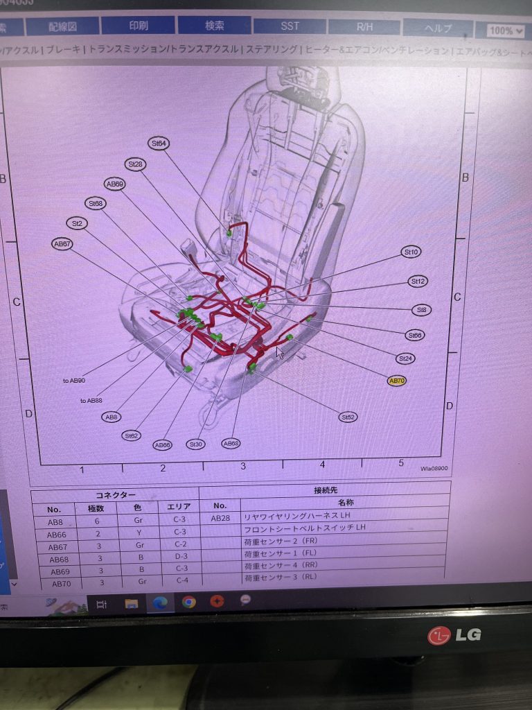 配線図を確認し点検しました。結果は、荷重センサー3(RL)内部不良でした。